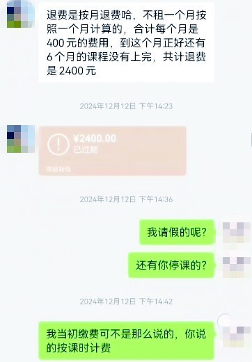 2024年12月10日,胡女士联系培训机构要求退费,但在退费金额上双方产生了分歧。胡女士表示,当初交费时双方口头约定按课时计费,每节课50元,胡女士自己统计未上的课时共计97节,应退费4850元;培训机构则表示4800元是一年的费用,退费方式是按月退费,每月400元,不足一月按一个月计算,胡女士的女儿还有6个月的课程没上,应退费用为2400元。